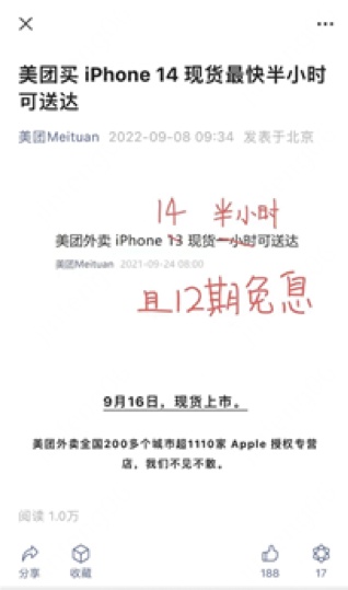 每年新款iPhone上市时都会掀起新一轮狂欢,今年iPhone14发布后,美团带头发起了iPhone14配送大战。
