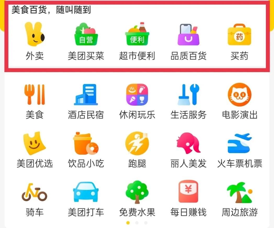 最近,美团APP首页进行改版,在顶部新增了“美食百货,随叫随到”专区,专区里蔬菜水果、超市便利、品质百货、买药四个一级入口,都是同城零售业务,隶属美团闪购项目。