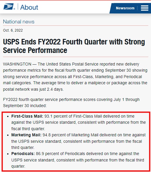 具体来看,USPS 2022财年第四季度服务绩效涵盖7月1日至9月30日,包括:头等舱邮件: 93.1%的头等舱邮件按USPS服务标准准时送达,与第三财季的业绩一致;营销邮件: 94.8%的营销邮件按照USPS服务标准准时送达,与第三财季的业绩一致;定期邮件: 86.9%的期刊按USPS服务标准按时交付,与第三财季的业绩一致。