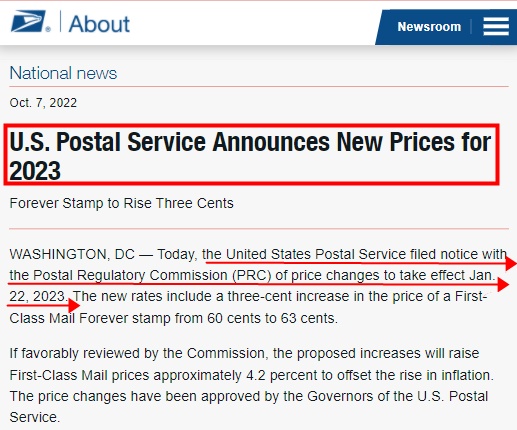 10月10日消息,美国邮政局(USPS)周五宣布,其向邮政监管委员会(PRC)提交了关于价格变动的通知,将于2023年1月22日生效。新费率包括将头等舱价格上涨3美分,Mail Forever邮票从60美分到63美分。如果委员会顺利审查,拟议的涨价将使一级邮件价格提高约4.2%,以抵消通货膨胀的上升。目前,价格变动已获得美国邮政总局局长的批准。