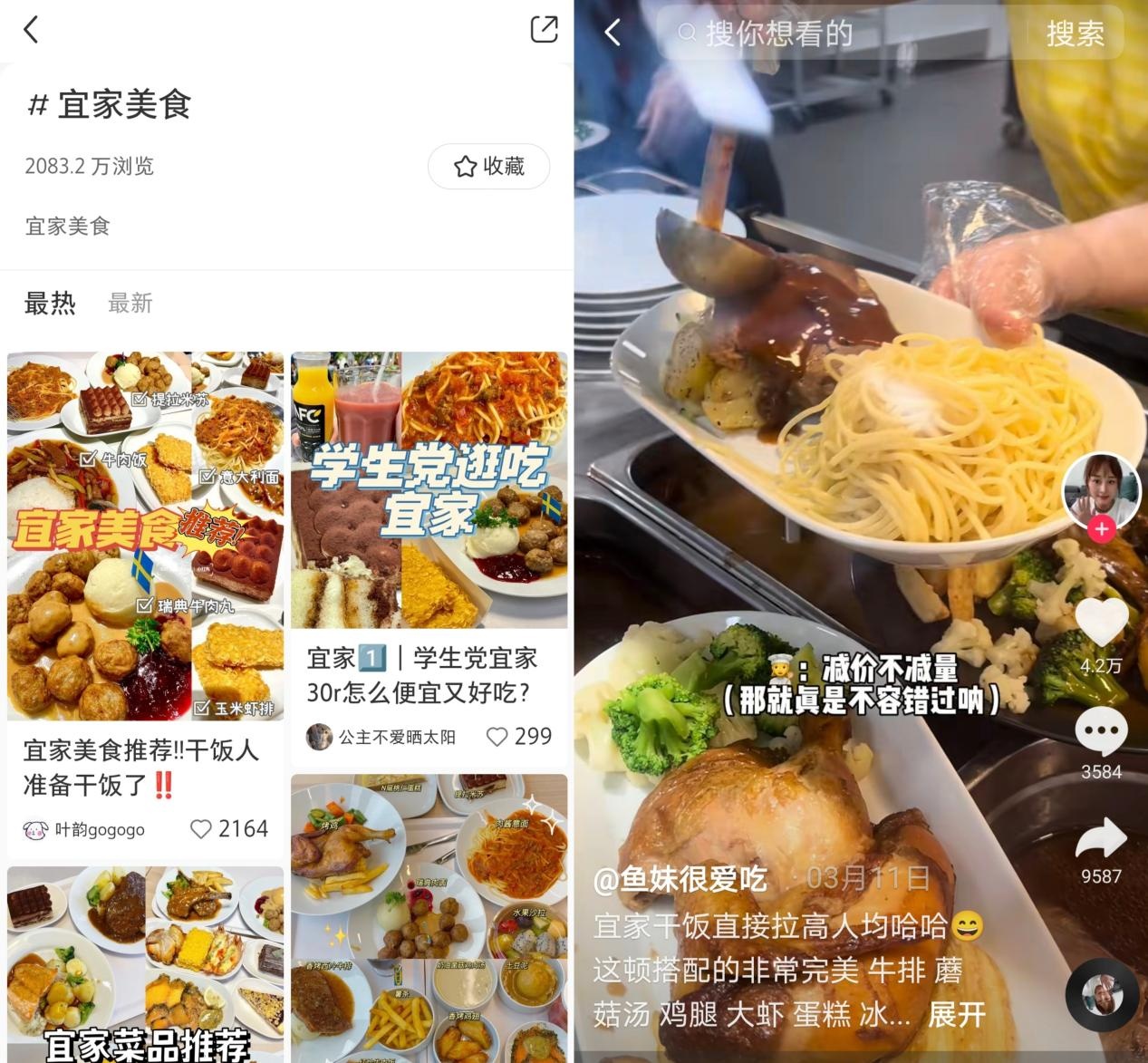 截至10月8日,小红书中,宜家美食的话题阅读量达到2083.2万浏览量;抖音、快手等平台上的相关探店视频播放量也是居高不下,宜家美食可谓是自带流量。
