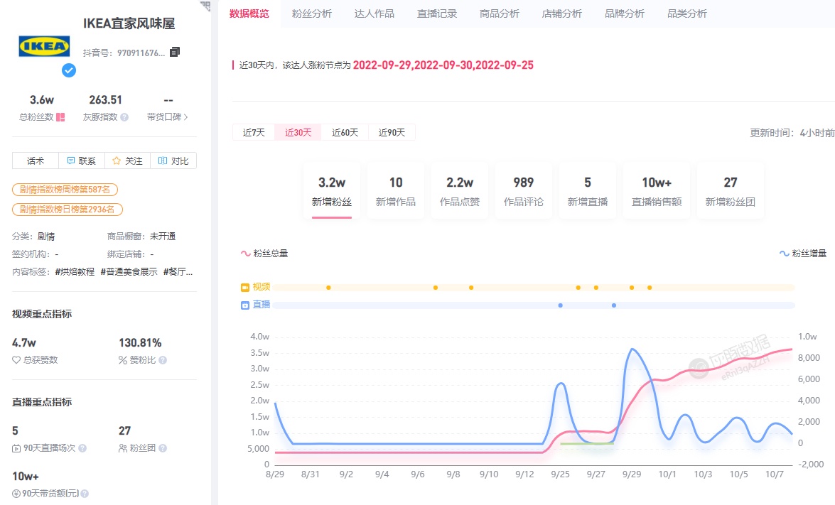 据灰豚数据显示,截至10月8日,宜家风味屋共带货5场,直播销售额已经突破10万元。