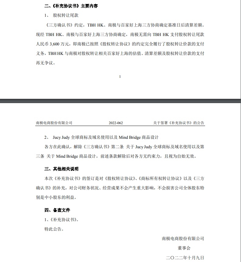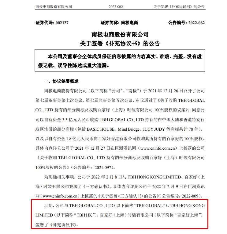 公告指出,为明确相关事项,南极电商于2022年2月8日与TBH HONG KONG LIMITED、百家好(上海)时装有限公司签署了《三方确认书》。