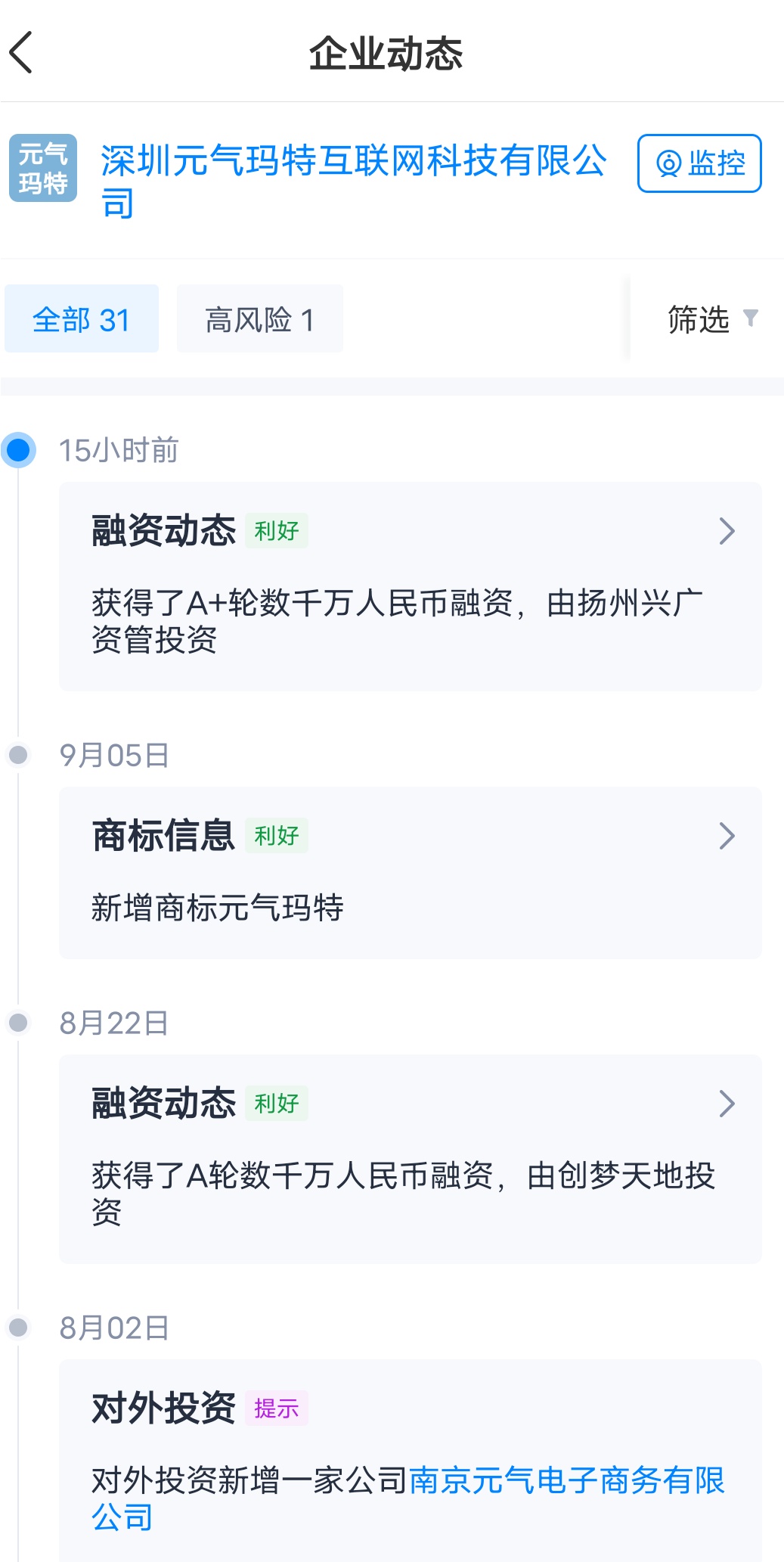 此前,元气玛特于今年8月宣布获康佳创投基金数千万A轮投资。上市公司深圳市创梦天地科技有限公司,南京市产业发展基金以及央企成都安仁华侨城文化旅游开发有限公司为该基金投资方。