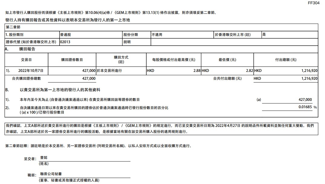 本年內至10月7日为止 (自普通决议案通过以来) 在港交所购回该等证券的数目为42.7万股,自决议案通过日期以来在港交所购回的证券占于普通决议案通过时已发行股份数目的百分比为0.01685%。