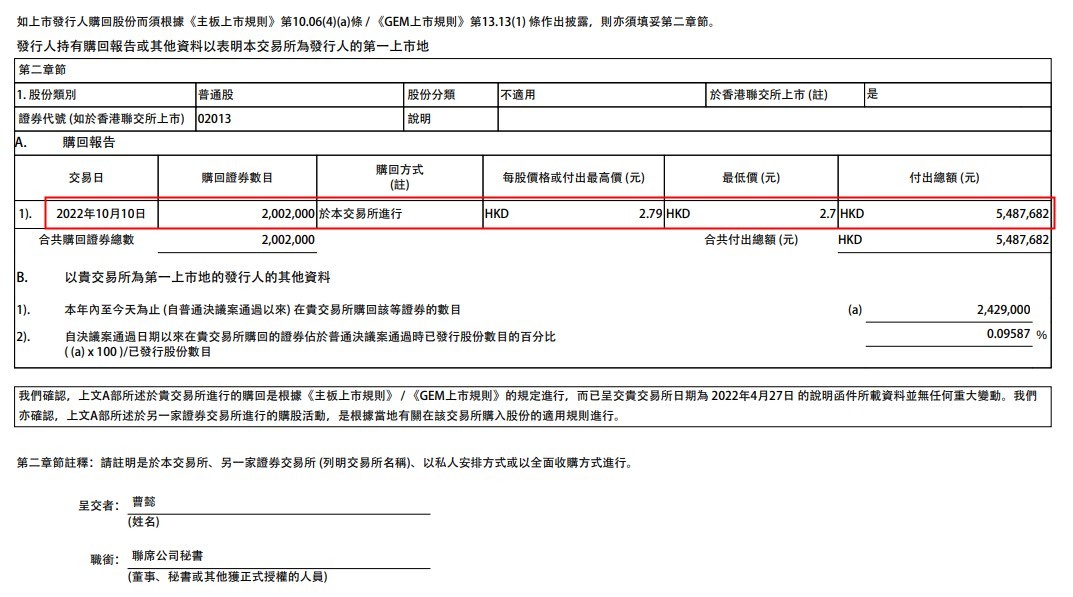 10月10日消息,微盟集团在港交所发布公告称,于2022年10月10日斥资约548.77万港元回购股份200.2万股,每股回购价格为2.7-2.79港元。