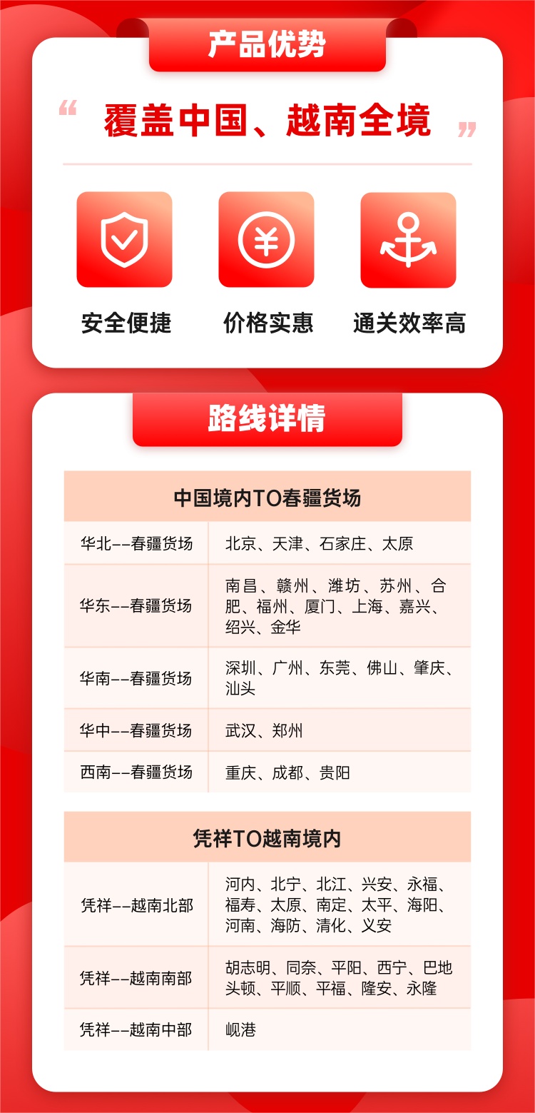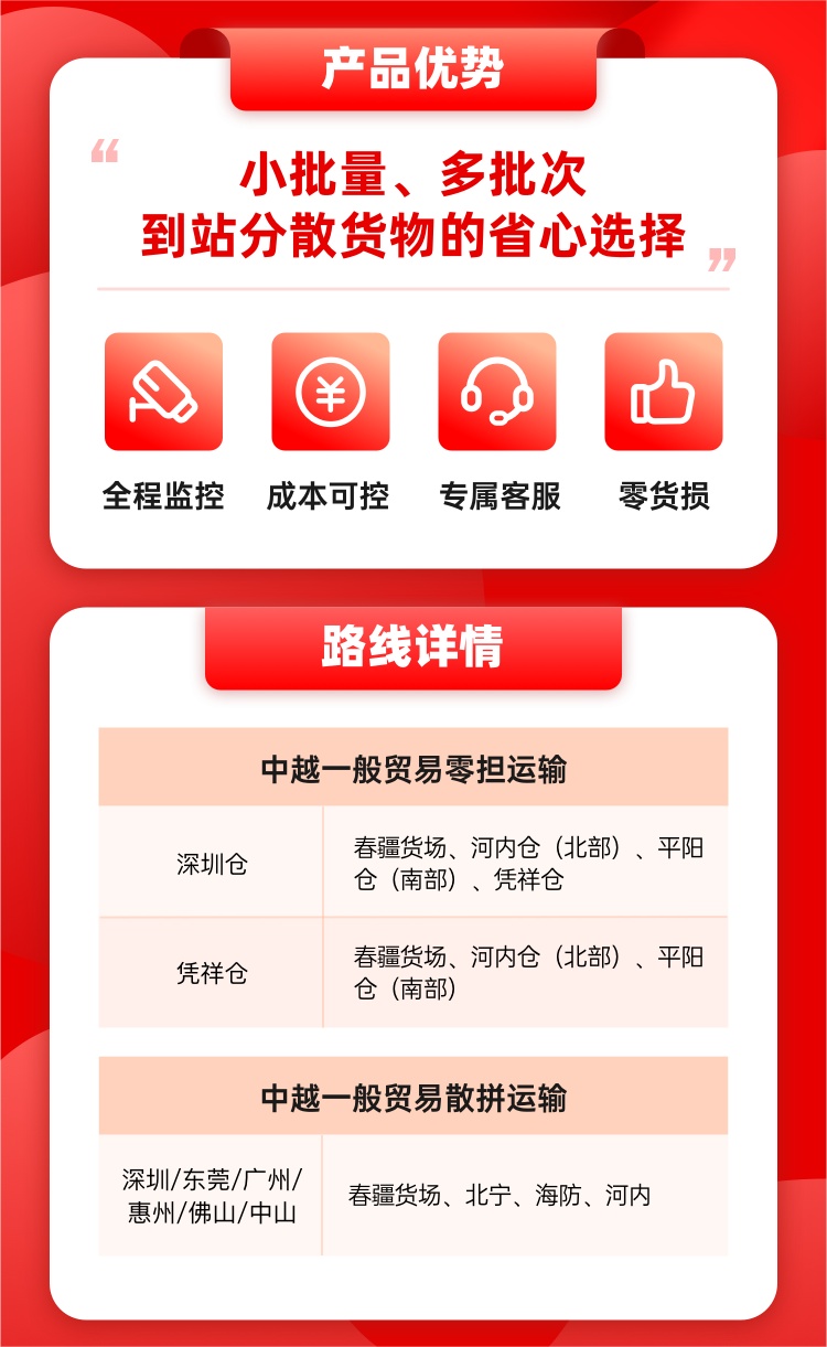 其中,中越一般贸易整车运输的优势在于,价格优惠,成本可控,时效稳定,体验保障,国内全境发车,越南全境派送,专属客服一对一服务;中越一般贸易零担/散拼运输的优势在于,便捷安全,价格实惠,时效稳定,零货损,不叠板或压货,专属客服一对一服务。