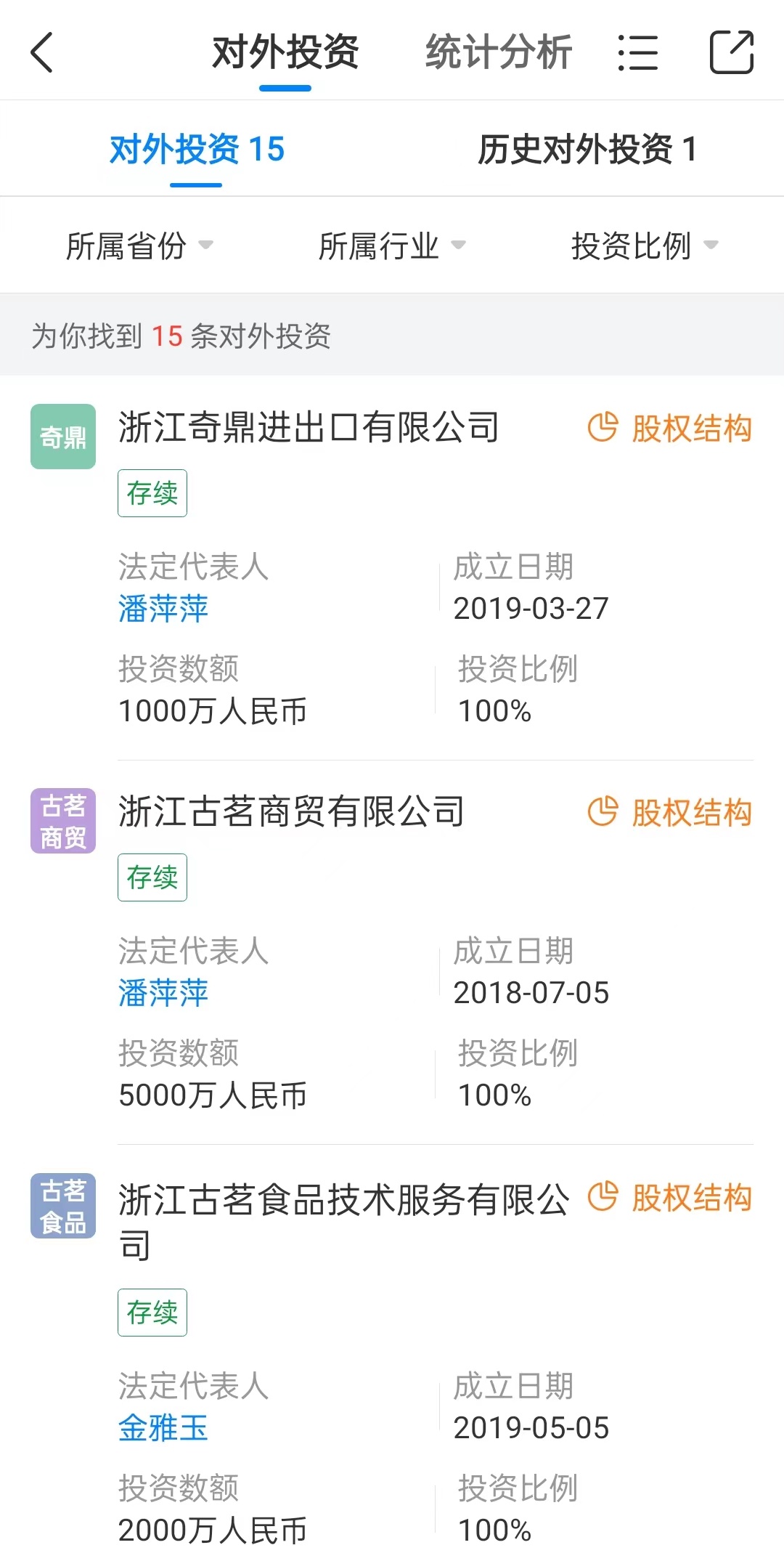 据天眼查不完全信息统计,成立至今,该公司已对外投资15家公司,分布于浙江、云南、上海,包括浙江奇鼎进出口有限公司、浙江古茗商贸有限公司、浙江古茗食品技术服务有限公司、浙江励川食品科技有限公司、浙江奇鼎供应链有限公司、浙江古茗后岸信息技术有限公司等。