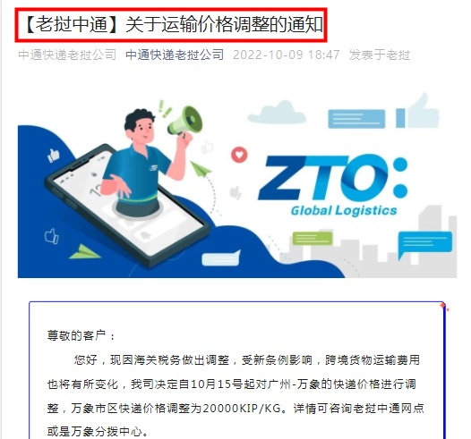 10月10日消息,中通快递老挝公司发文称,“因海关税务做出调整,受新条例影响,跨境货物运输费用也将有所变化,我司决定自10月15号起对广州-万象的快递价格进行调整,万象市区快递价格调整为20000KIP/KG。详情可咨询老挝中通网点或是万象分拨中心。”
