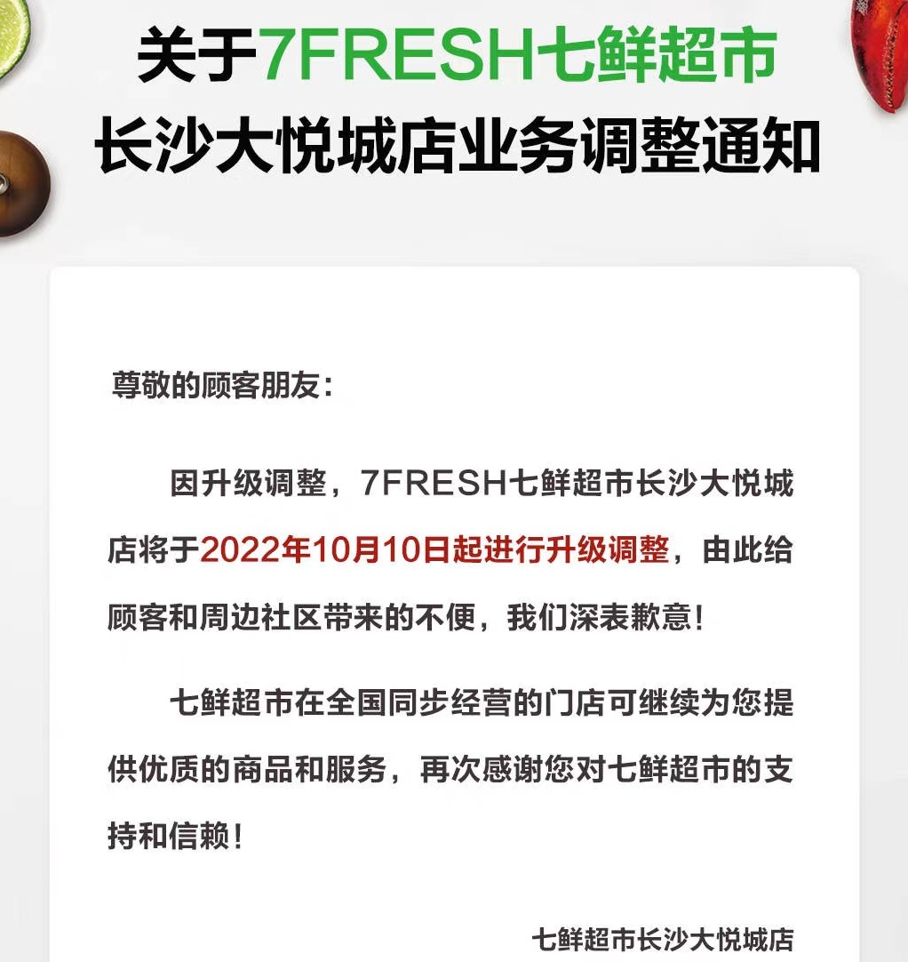 此前,京东七鲜超市长沙溪悦荟店也曾于8月30日发布公告称,超市于9月7日起闭店进行调整升级,预计9月中旬对外营业。