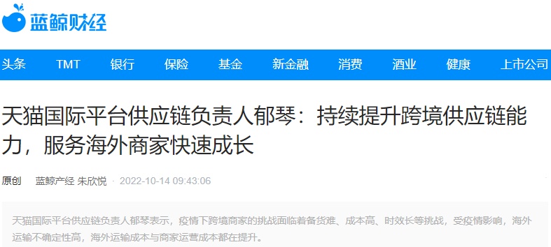 10月14日消息,在近日举办的【蓝鲸·新财智】“创新-未来”之【跨境物流 —— 国际商业新机遇】沙龙直播峰会上,天猫国际平台供应链负责人郁琴表示,疫情下跨境商家的挑战面临着备货难、成本高、时效长等挑战,受疫情影响,海外运输不确定性高,海外运输成本与商家运营成本都在提升。