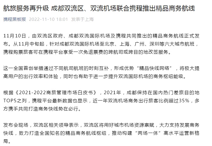 根据《2021-2022商旅管理市场白皮书》,2021年,成都保持在国内热门差旅目的地TOP5之列,携程平台最新数据也显示,近一年双流机场商务出行旅客比例超过35%,多方携手共同打造商务快线势在必行。