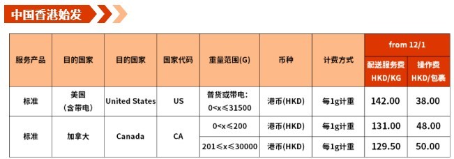 以上价格为港币报价,适用于起运地为香港地区。无需另加燃油附加费,美国,澳大利亚和加拿大标准服务最低50G计费。 以上各国标准服务价卡也适用于各国标准型带电包裹,如有变更,另行通知。