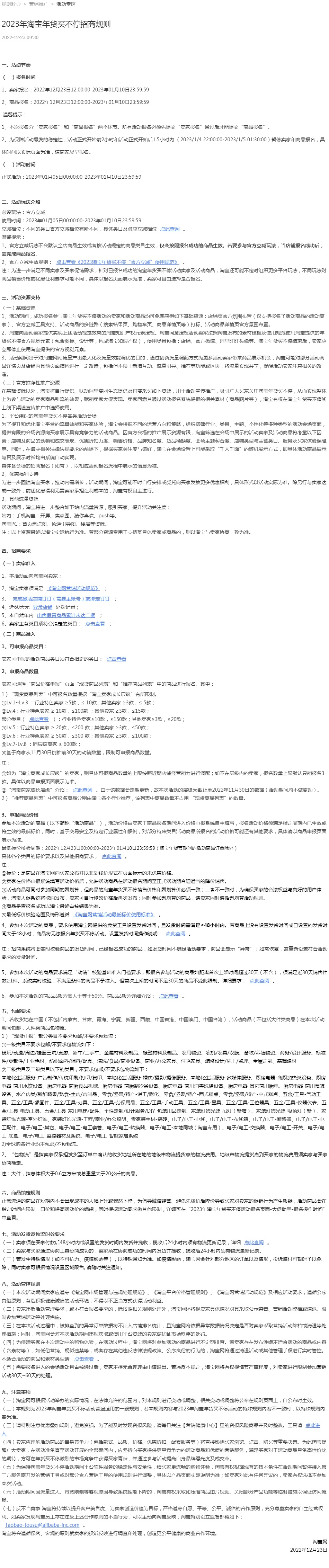 淘宝网近日还发布2023年淘宝年货买不停招商规则,卖家报名时间2022年12月23日12:00:00-2023年1月10日23:59:59 ,商品报名时间2022年12月23日12:00:00-2023年1月10日23:59:59 。本次报名分“卖家报名” 和“商品报名”两个环节。所有活动报名必须先提交“卖家报名”通过后才能提交“商品报名”。为保障活动爆发的稳定性,活动正式开始前2小时和活动正式开始后1.5小时内 (2023/1/4 22:00:00-2023/1/5 01:30:00)暂停卖家和商品报名,具体时间以实际页面为准,请商家尽早报名。正式活动时间2023年1月5日00:00:00-2023年1月10日23:59:59。