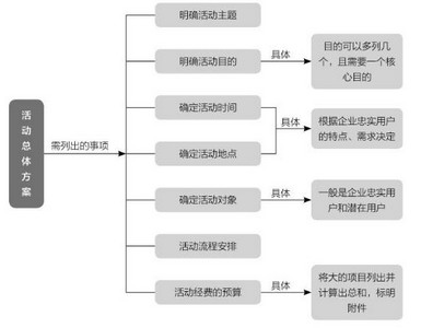 设计活动整体方案框架的基本要求有三点,第一,简单、明了、易懂;第二内容无需过多;第三,要素全面完整。另外,企业在活动中推出的商品会随着市场需求发生变化,存在不可控风险,且无论多么完善的市场调查,商家都无法完全掌握消费者心理。因此前期策划需要后期应变调整和完善。