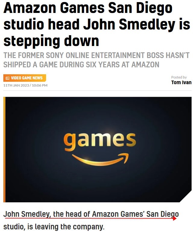 据悉,Smedley于2017年加入亚马逊,参与过各种项目,但都没有发布。在加入亚马逊前,他曾是前索尼在线娱乐公司总裁。
