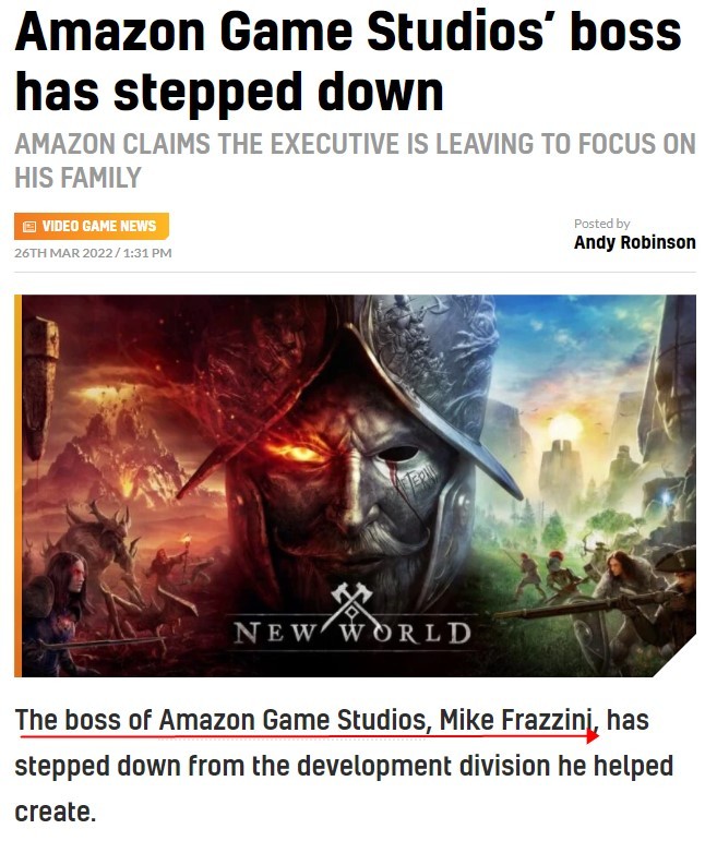 2022年3月,有媒体报道,亚马逊游戏工作室(Amazon Game Studios)创始人迈克•弗拉奇尼(Mike Frazzini)已经离职。亚马逊发言人瑞恩·琼斯Ryan Jones说,这位高管告诉员工,他离开是为了专注于家庭。
