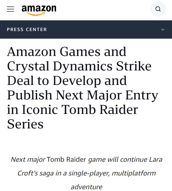 值得一提的是,2022年12月,亚马逊游戏和Crystal Dynamics宣布他们已达成协议,Crystal Dynamics将开发新的多平台古墓丽影游戏,Amazon Games将提供全面支持并在全球发行该游戏。