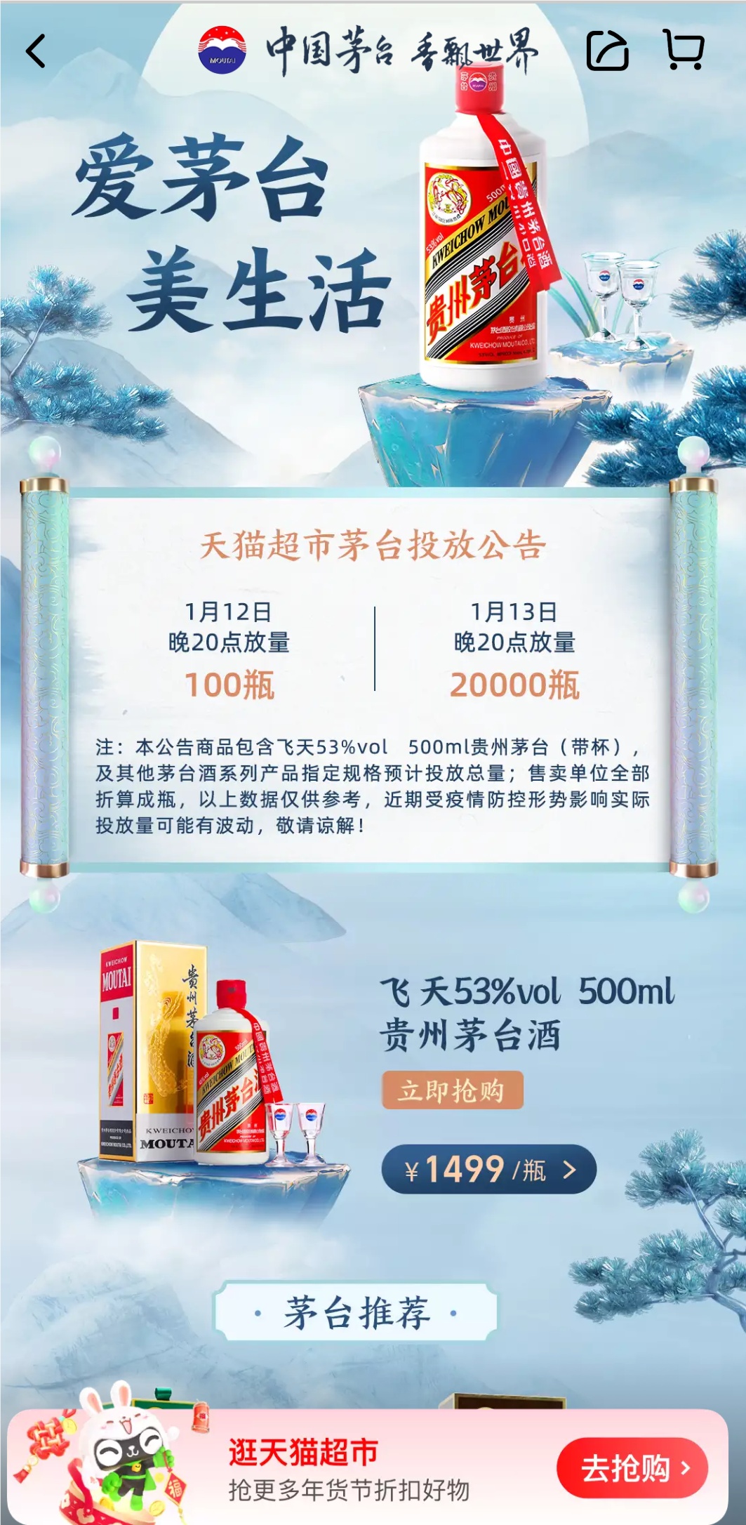 天猫超市明天将放量20000瓶1499元飞天茅台