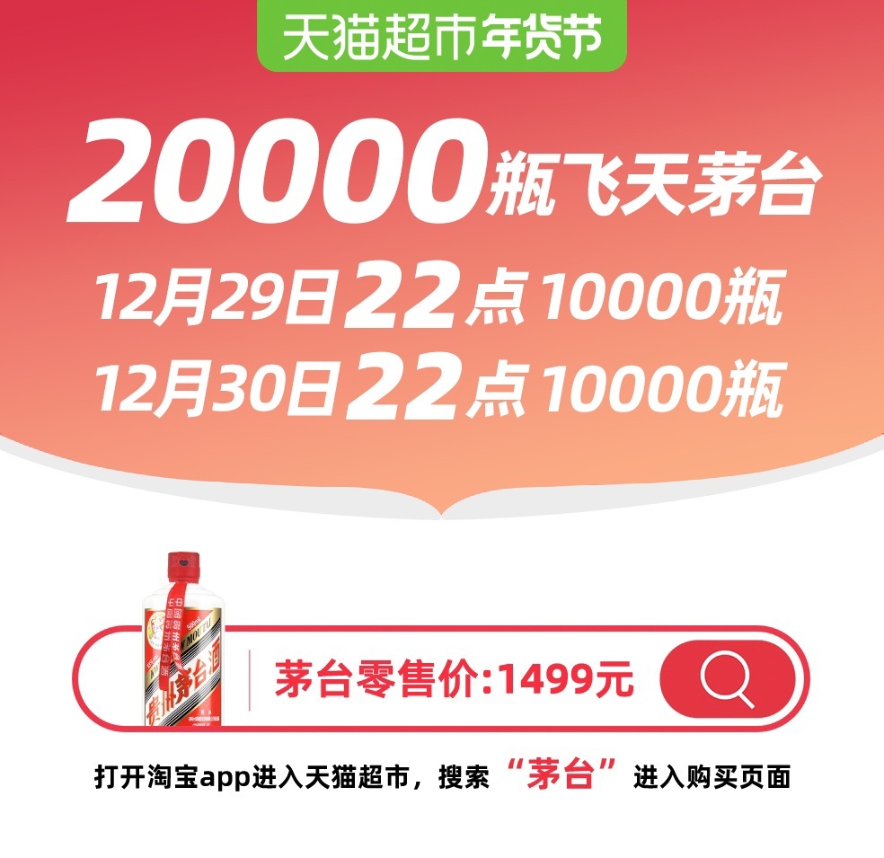 天猫超市此前发布公告显示,天猫超市年货节放量20000瓶1499元飞天茅台,2022年12月29日、30日各10000瓶。抢购的时间定在了晚上22:00。