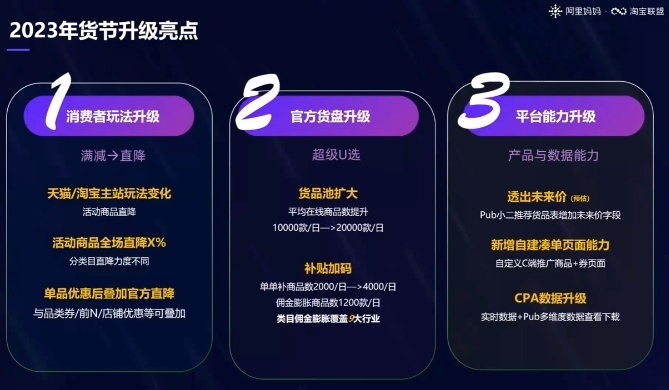 其中,消费者玩法上,主站活动商品升级为直降玩法,官方活动直降与单品优惠叠加使用,各类目直降力度不同;官方货盘上,“超级U选”货品池由10000款/日扩大为20000款/日,补贴商品数由2000/日增加为4000/日,覆盖更多行业;平台能力上,产品与数据能力升级,助力年货节增长,新增未来价透出、自建凑单页面、CPA数据升级。