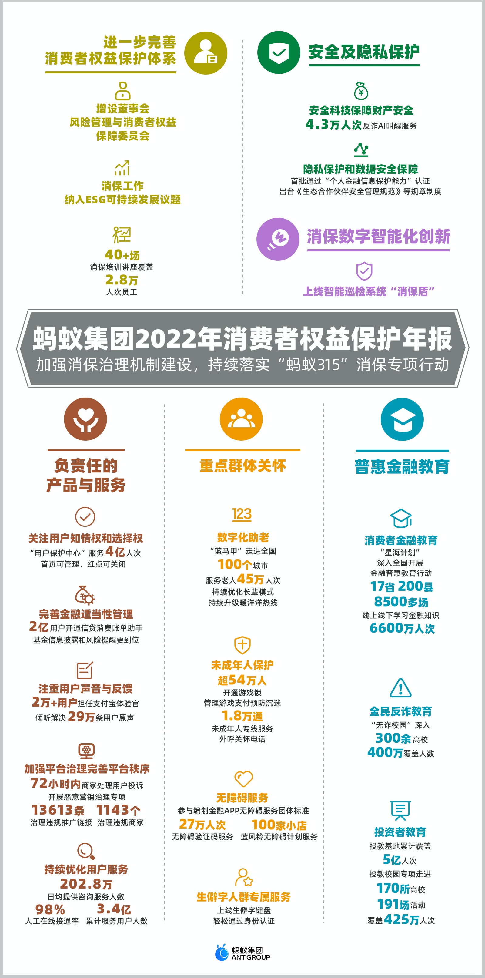 1月12日消息,蚂蚁集团在其官网发布2022年消费者权益保护年报。报告显示,2022年蚂蚁集团进一步加强消保治理机制建设,持续落实消保专项行动“蚂蚁315”。