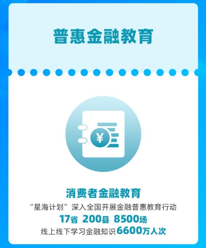 在金融消费方面,为提升用户保护意识和能力,蚂蚁集团同中国金融教育发展基金会共同支持开展金融普惠教育“星海计划”,深入全国17省200个县级行政区,开展8500多场金融普惠教育行动;