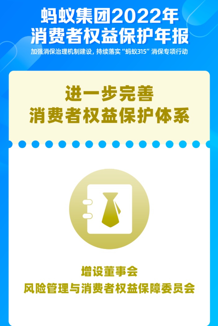 在公司治理层面,蚂蚁集团2022年增设董事会风险管理与消费者权益保障委员会,形成集团消费者权益保护部联动持牌消保团队,牵头业务消保治理及管控,向管理层及董事会汇报的架构保障与内控制度,并将消费者权益保护融入ESG可持续发展战略的各个议题,构建起目标清晰、架构合理、保障充分、执行有效的落地机制。