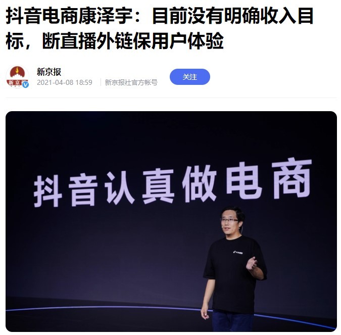 值得一提的是,2020年10月9号,抖音宣布切断淘宝、天猫等外部电商平台的外部商品链接。时任抖音电商总裁康泽宇回应:在切掉外链之前,抖音电商GMV的来源很大占比都是通过站内闭环完成的,商家也大部分是在小店的。整体来讲,(切断外链)用户的体验更好,商家也基本都做好准备了。