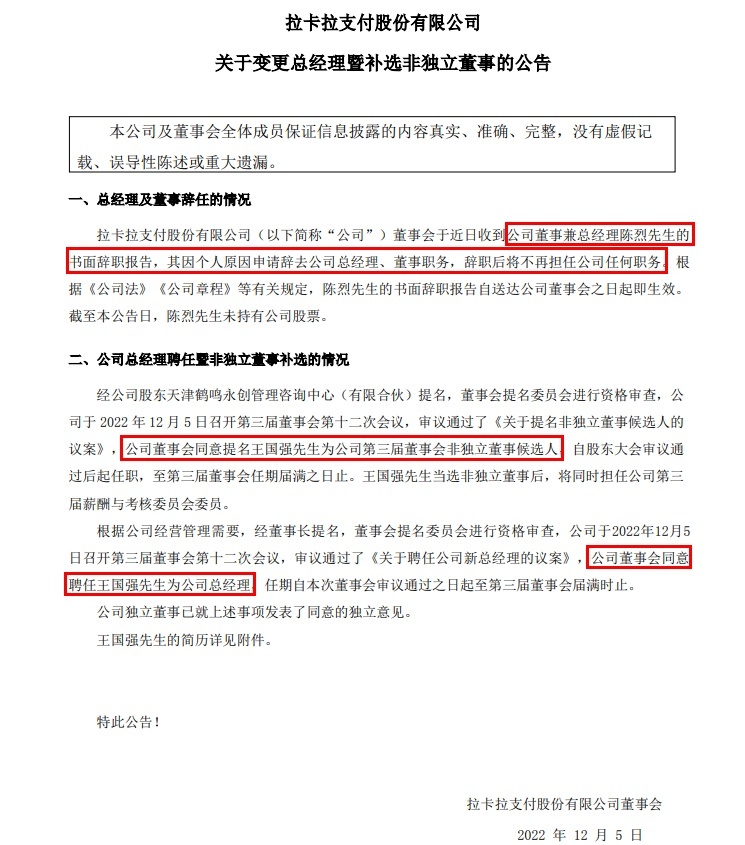 此前2022年12月6日,拉卡拉发布关于变更总经理暨补选非独立董事的公告称,陈烈因个人原因申请辞去公司总经理、董事职务,辞职后将不再担任公司任何职务。