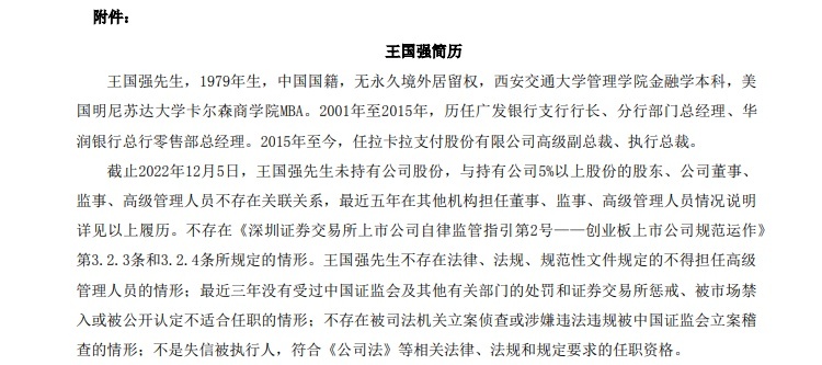 公告附件显示,王国强,1979年生,西安交通大学管理学院金融学本科,美国明尼苏达大学卡尔森商学院MBA。2001年至2015年,历任广发银行支行行长、分行部门总经理、华润银行总行零售部总经理。2015年至今,任拉卡拉支付股份有限公司高级副总裁、执行总裁。