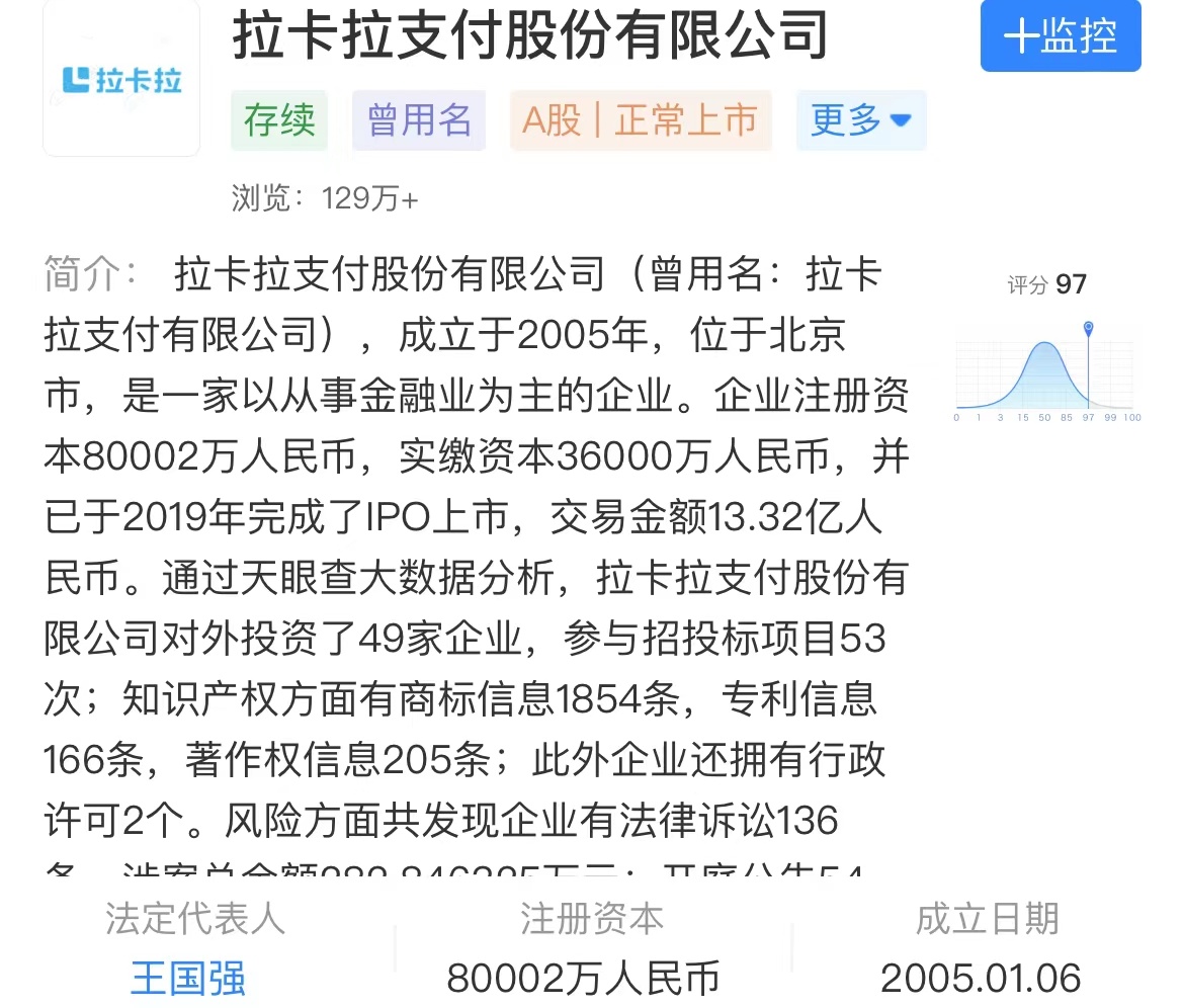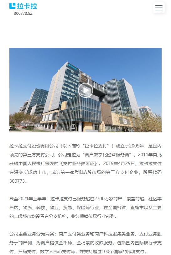 官网资料显示,拉卡拉支付于2019年4月25日在深交所成功上市,成为第一家登陆A股市场的第三方支付企业。