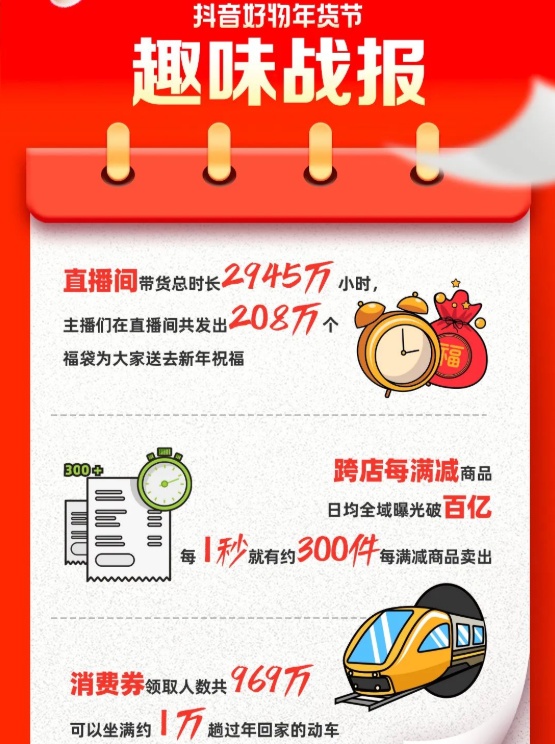 1月12日消息,抖音好物年货节落下帷幕,抖音发布趣味战报披露大促热销趣闻。