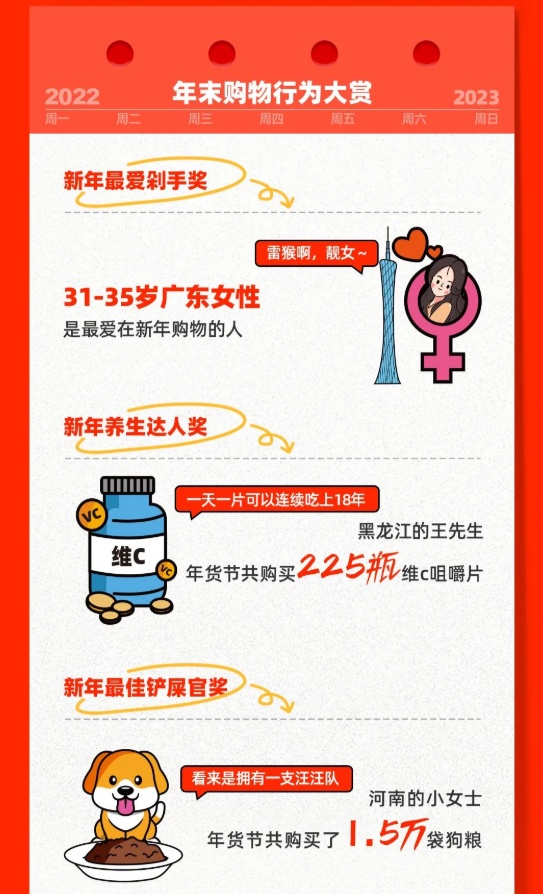 站内年味儿浓度Max,消费者购置新年装备及送礼年货的热情高涨,“家乡年货”直播专场观看人次达亿级,柳州螺蛳粉成为最受欢迎的地方年货;红包、春联等商品累计销售超818万件。其中广东人最爱发红包,江苏人最爱贴对联;高粱饴、牛轧糖、巧克力是大家过年最爱的糖果,上海50+女性最爱买糖;茶叶、坚果、白酒等成为春节送礼首选,活动期间卖出的酒水可以灌满约7个游泳池。
