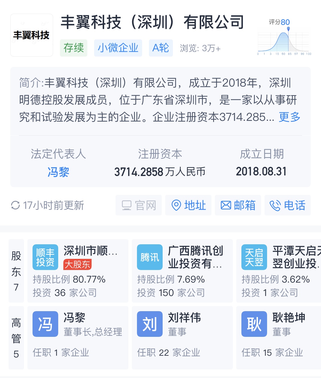 公开信息显示,丰翼科技(深圳)有限公司成立于2018年3月,注册资本约3714万人民币,由深圳市顺丰投资有限公司持股80.77%。据悉,丰翼科技是顺丰旗下末端配送无人机公司。