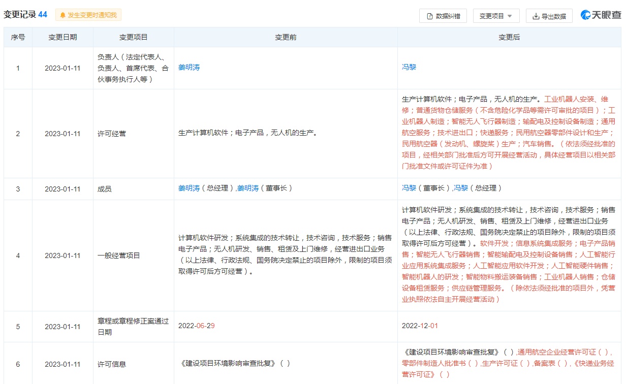 1月13日消息,天眼查信息显示,近日,丰翼科技(深圳)有限公司发生工商变更,姜明涛卸任法定代表人、董事长兼总经理,由冯黎接任;经营范围新增工业机器人安装、维修;普通货物仓储服务;通用航空服务;快递服务;民用航空器(发动机、螺旋桨)生产;智能无人飞行器销售;智能物料搬运装备销售等;许可信息新增通用航空企业经营许可证、快递业务经营许可证等。