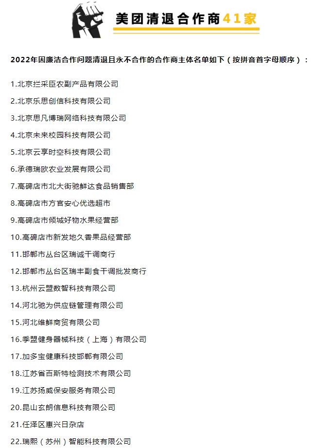 美团还公布了2022年因廉洁合作问题清退且永不合作的合作商主体名单,北京拦采臣农副产品有限公司、北京乐思创信科技有限公司、北京思凡博瑞网络科技有限公司、北京未来校园科技有限公司、北京云享时空科技有限公司、承德瑞欧农业发展有限公司、高碑店市北大街驰鲜达食品销售部等共41家。