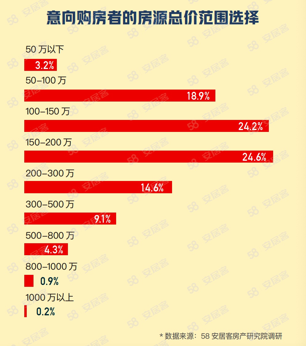 在户型偏好方面,报告显示,61.2%的购房者选择购买三居室的房源,其次是两居室,占比为26.3%。在房源总价方面,预算在150-200万的购房者占比最高,为24.6%,其次是预算在100-150万购房者,占比为24.2%。此外,预算50-100万、200-300万的购房者,占比分别为18.9%、14.6%。