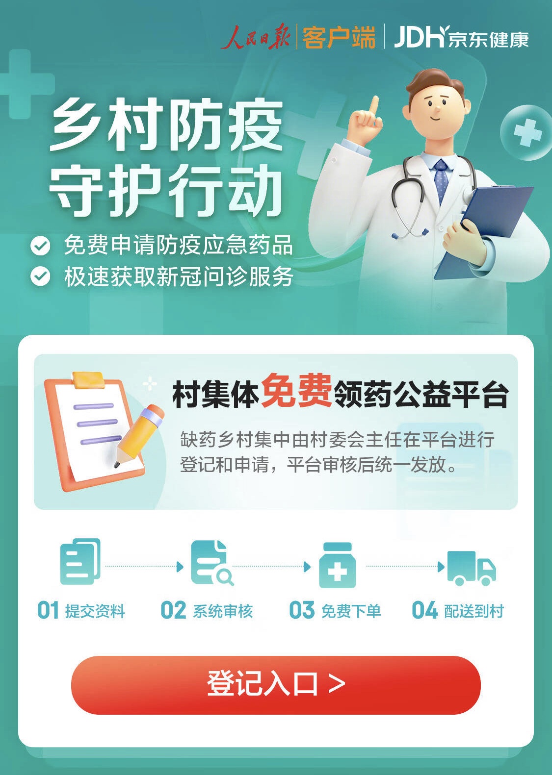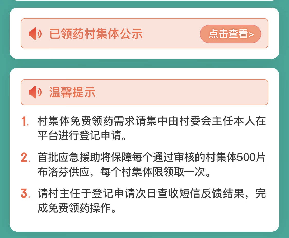 京东方面表示,在全国范围内,如果任何一个乡村缺少退烧药,可请村主任代表全村人申请集体免费领药,登录京东APP搜索“乡村防疫”进入登记平台,审核通过后即可在线免费领取,由京东物流小哥送药到村。