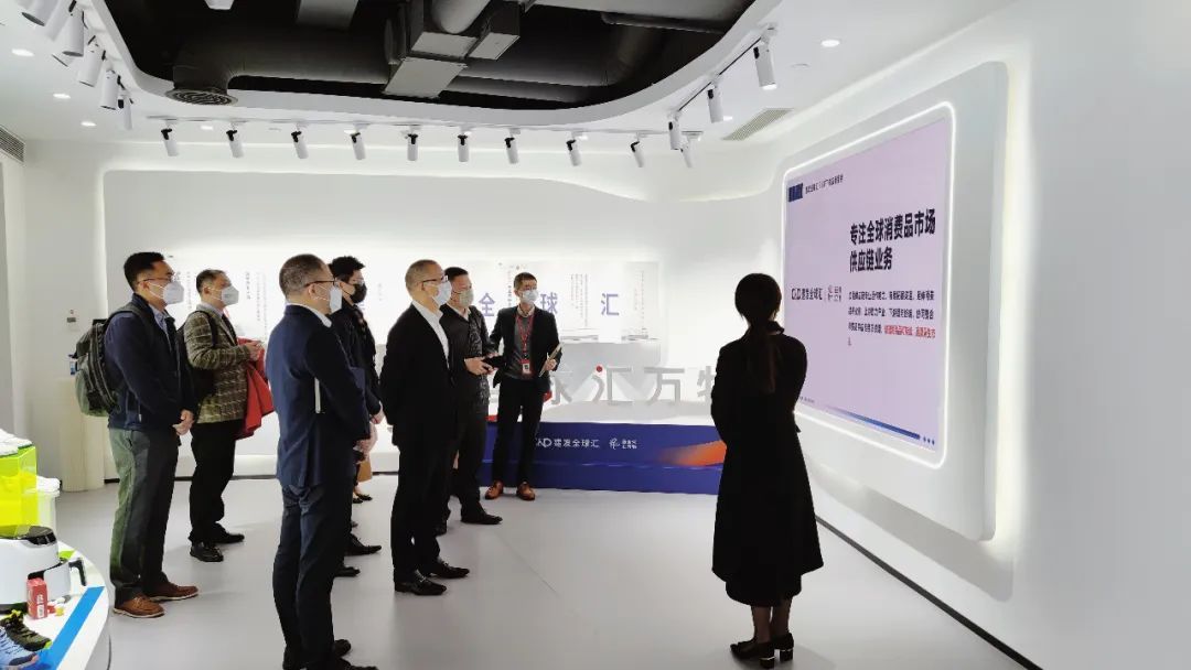 仪式正式开始前,建发股份物流管理部总经理徐标带领万纬团队参观了建发全球汇展厅,介绍了建发股份在消费品的全球供应链、消费品生态圈构造、卓越品牌赋能和新零售业务开拓的成果,尤其是在轻纺、食品、生活用品、酒类等多个消费品细分领域的供应链专业服务能力。