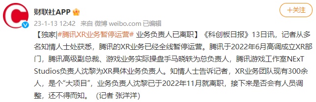 1月13日消息,《科创板日报》记者从多名知情人士处获悉,腾讯的XR(扩展现实)业务已经全线暂停运营。知情人士透露,XR业务团队现有300余人,接下来是否会有人员调整,还不得而知。