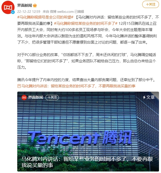 值得一提的是,2022年12月,腾讯在线上召开内部员工大会,同时有大约100多名员工现场参与听会,此次大会的主题是降本增效。