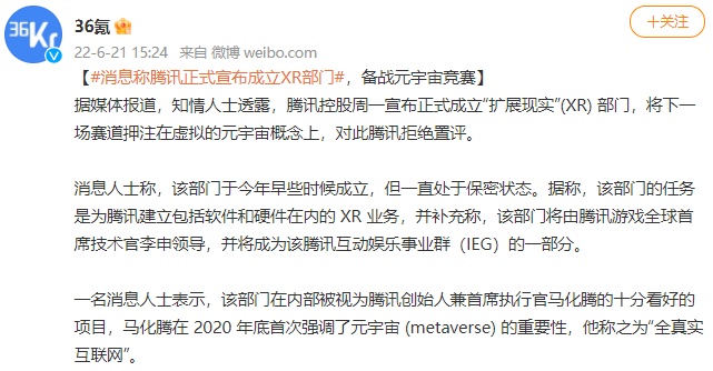 据悉,腾讯于2022年6月成立XR部门,消息人士称,该部门的任务是为腾讯建立包括软件和硬件在内的扩展现实业务,并将成为该公司互动娱乐事业群(IEG)的一部分。腾讯高级副总裁、游戏业务实际操盘手马晓轶为总负责人,腾讯游戏工作室NExTStudios负责人沈黎为XR具体业务负责人。