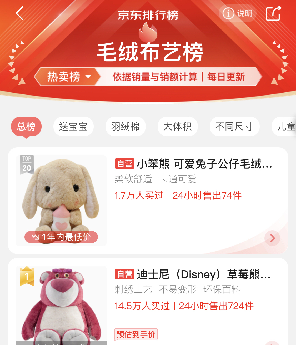春节期间礼赠需求明显增长。在为孩子选购礼物方面,模型玩具、益智玩具以及造型可爱的毛绒玩具成为优先选择。其中,迪士尼热门IP草莓熊成交额同比增长100%,成新春送孩子的首选毛绒玩具;迪士尼、OlarHike、爱尚熊成为毛绒玩具TOP3品牌。模型玩具成交额同比增长69%,益智玩具成交额同比增长48%。
