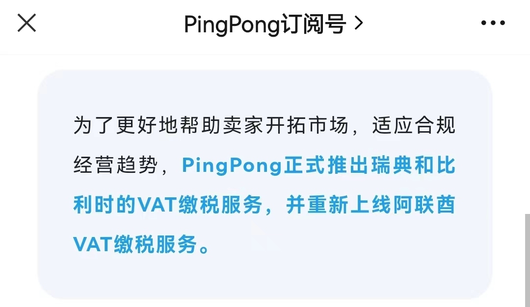 1月16日消息,为了更好地帮助卖家开拓市场,适应合规经营趋势,PingPong正式推出瑞典和比利时的VAT缴税服务,并重新上线阿联酋VAT缴税服务。