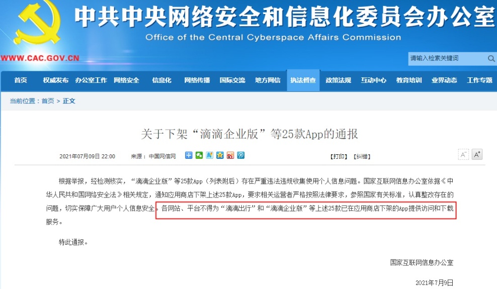 随后的7月9日,国家网信办发布通报,经检测核实,“滴滴企业版”等25款APP存在严重违法违规收集使用个人信息问题。依据相关规定,通知应用商店下架这25款APP,要求相关运营者认真整改。各网站、平台不得为“滴滴出行”和“滴滴企业版”等25款已在应用商店下架的APP提供访问和下载服务。