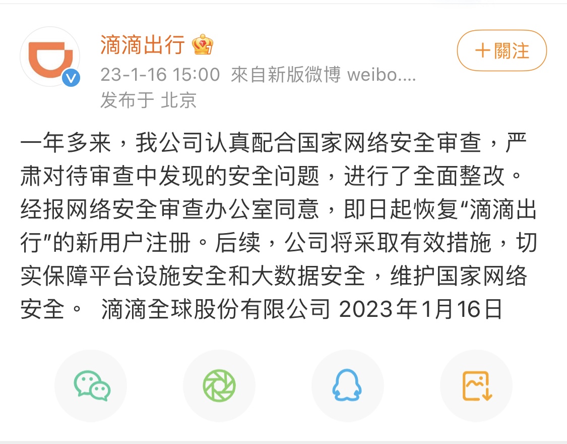 1月16日消息,滴滴出行今日发布微博表示:一年多来,我公司认真配合国家网络安全审查,严肃对待审查中发现的安全问题,进行了全面整改。经报网络安全审查办公室同意,即日起恢复“滴滴出行”的新用户注册。后续,公司将采取有效措施,切实保障平台设施安全和大数据安全,维护国家网络安全。