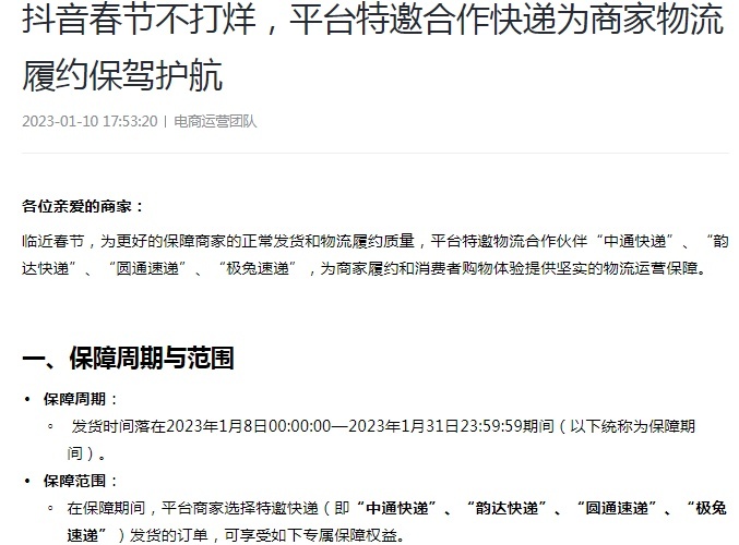 此外,抖音电商春节期间也特邀物流合作伙伴极兔速递等四大物流品牌,为商家履约和消费者购物体验提供物流运营保障。保障期间为2023年1月8日00:00:00-2023年1月31日23:59:59。保障范围为保障期间内平台商家选择特邀快递发货的订单,可享受赔付兜底、履约保障、价格承运、专属客服四项快递服务权益。