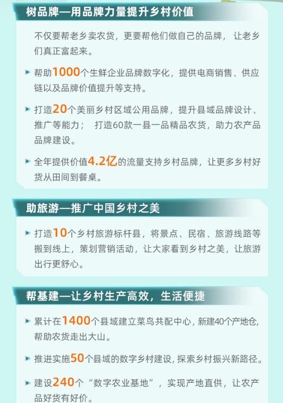 在基础建设方面,计划累计在1400个县域建立菜鸟共配中心,新建40个产地仓帮助农货走出大山;推进实施50个县域的数字乡村建设;建设240个“数字农业基地”,实现产地直供,让农产品好货有好价。