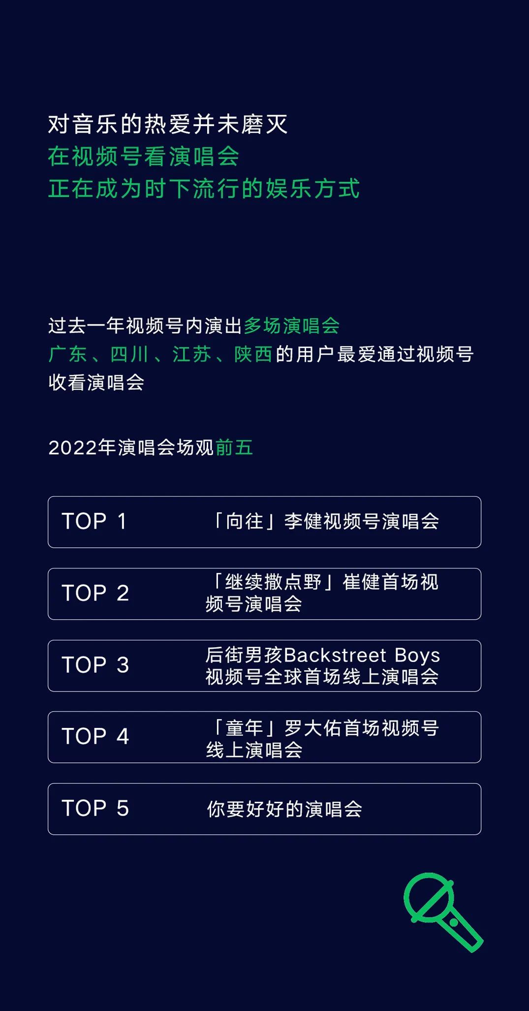 2022年演唱会场观前五分别为:李建视频号演唱会、崔健首场视频号演唱会、后街男孩视频号全球首场线上演唱会和你要好好的演唱会。